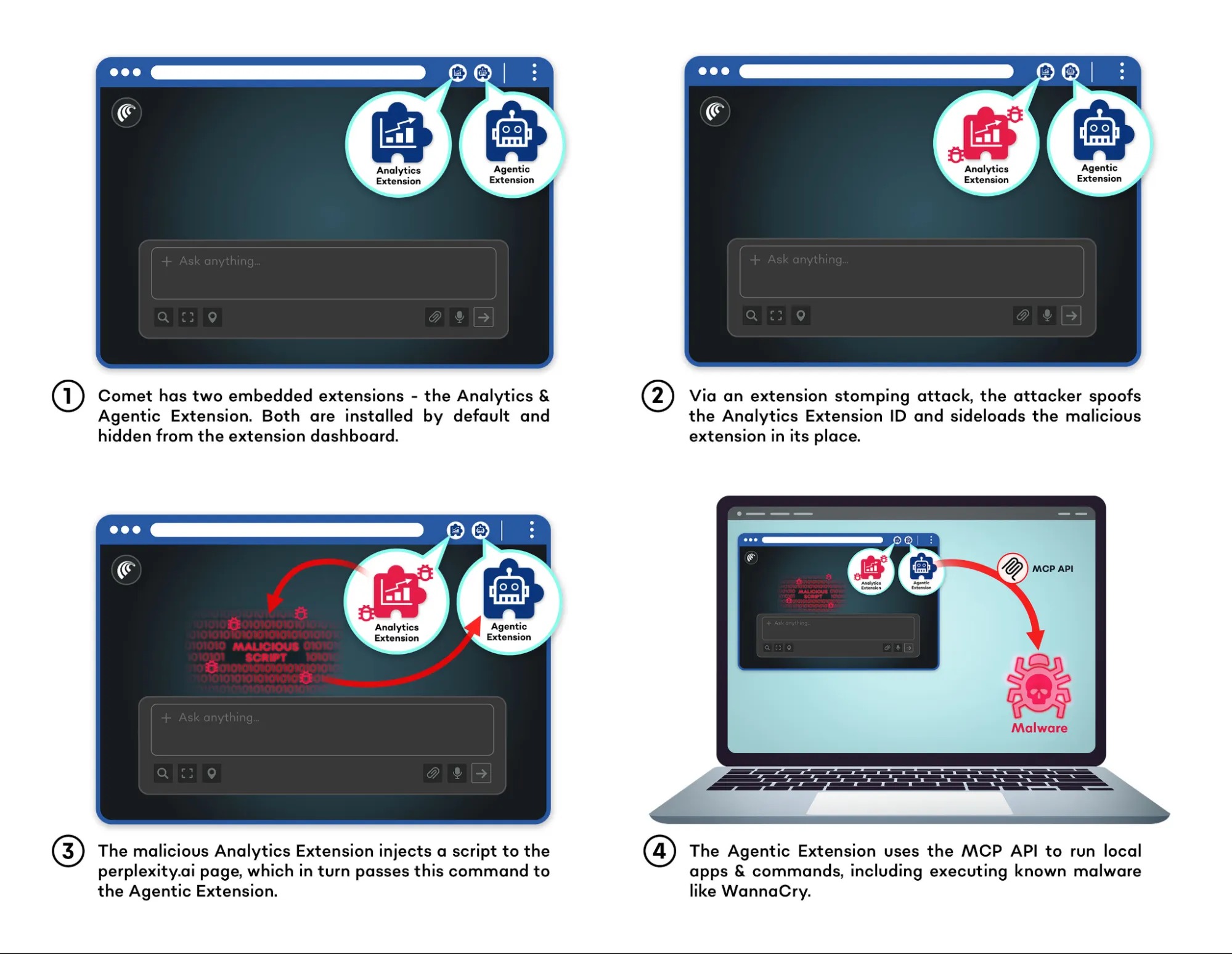 Уязвимость связана с малодокументированным MCP API (chrome.perplexity.mcp.addStdioServer) и двумя скрытыми расширениями — Agentic и Analytics. Они встроены в браузер Comet, не могут быть отключены и имеют доступ к MCP API.