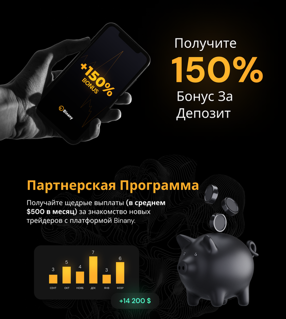 Чтобы начать ваше торговое путешествие, Binany предлагает бонус 150% на первый депозит. Увеличьте свой начальный капитал и воспользуйтесь этим уникальным предложением, чтобы торговать с еще большей гибкостью и потенциальной доходностью.