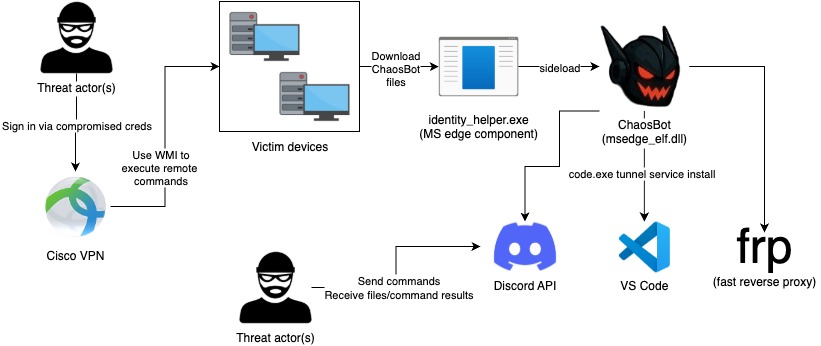 «Атакующие использовали украденные учетные данные, которые подходили как для Cisco VPN, так и для привилегированной учетной записи Active Directory с именем serviceaccount, — рассказывают специалисты. — Используя скомпрометированный аккаунт, они задействовали WMI для выполнения удаленных команд на системах в сети, что облегчило развертывание и запуск ChaosBot».