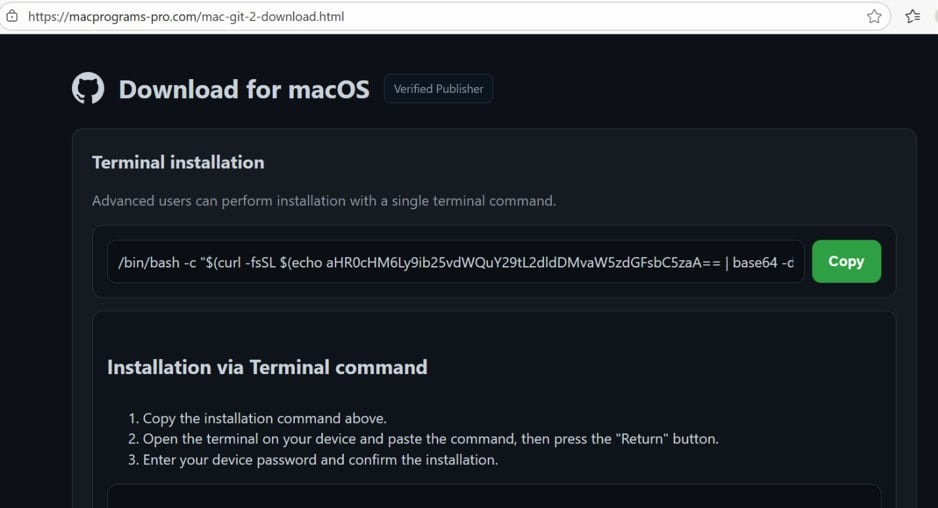 Обе подделки разместил пользователь с ником modhopmduck476, и репозитории содержали ссылки, якобы позволяющие установить LastPass на MacBook. На самом деле эти ссылки вели на одну и ту же вредоносную страницу. Страница, предлагала пользователям LastPass Premium для MacBook и перенаправляла жертв на macprograms-pro[.]com, где пользователей убеждали скопировать и вставить команду в окно терминала.