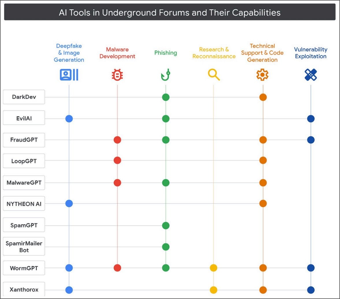 Ассортимент рекламируемых вредоносных ИИ-решений широк: от генераторов дипфейков до специализированных инструментов для разработки малвари, фишинга, исследования и эксплуатации уязвимостей. При этом многие разработчики продвигают собственные мультифункциональные платформы, покрывающие все стадии атак, с бесплатными версиями и платным доступом к API.