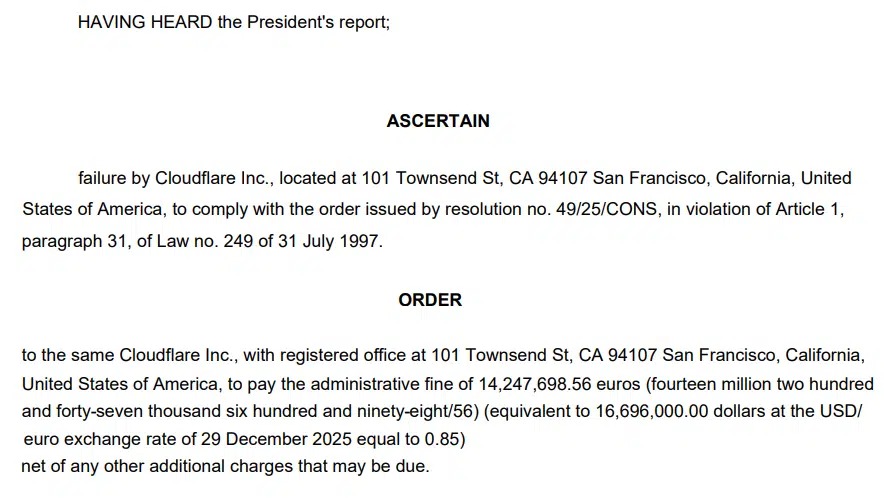 В результате, после рассмотрения всех аргументов, AGCOM назначил Cloudflare штраф в размере 14 247 698 евро. Регулятор постановил, что компания не выполнила требования антипиратского законодательства страны. Штраф составляет 1% от глобальной выручки компании (максимальный размер штрафа может доходить до 2%).