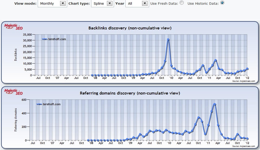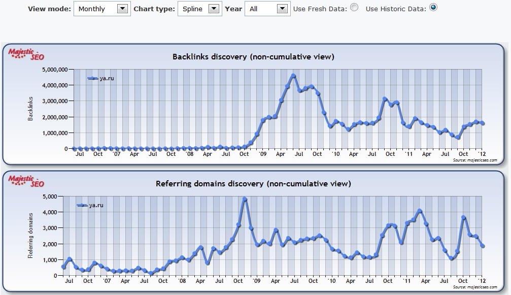 С недавнего времени я стал активно пользоваться сервисом http://www.majesticseo.com/, который позволяет получить историю появления backlinks (обратных ссылок) за большой период времени. Ниже представлен скриншот полученный из этого сервиса: