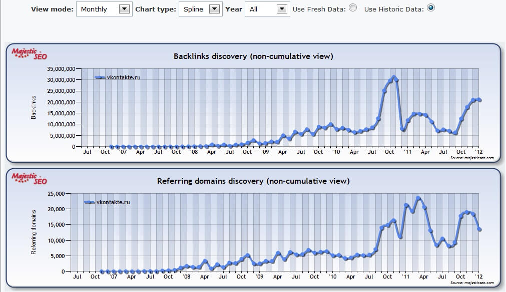 В случае, когда линия имеет наклон вниз это означает, что происходит уменьшение притока ссылок, а это свидетельствует о том, что сайт стал менее популярен среди пользователей. Пример идеального графика был представлен выше, когда мы рассматривали первый пример. Также примером идеального графика служит сайт vkontakte.ru: