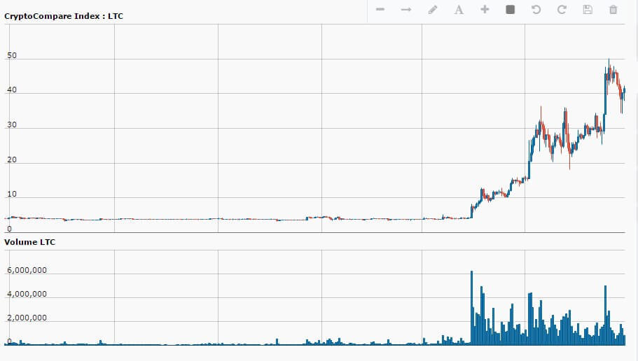 Лайткоин всегда раньше шагал нога в ногу с Биткоином (имею ввиду рост/падение). Но потом все деньги стали уходить в BTC, а LTC долгое время стоил в районе 4$.