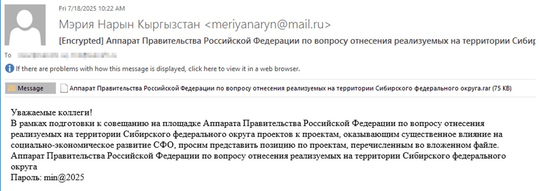 Обычно атаки хакеров начинаются с фишинговых писем с запароленными архивами. Внутри вложений находится исполняемый файл, замаскированный под документ: либо с двойным расширением типа .doc<пробелы>.exe, либо с длинным именем, скрывающим настоящее расширение при просмотре архива. Один из примеров приманки — письмо с просьбой дать отзыв по проектам, якобы направленным на развитие российских регионов. Если запустить файл из архива, это приведет к заражению.