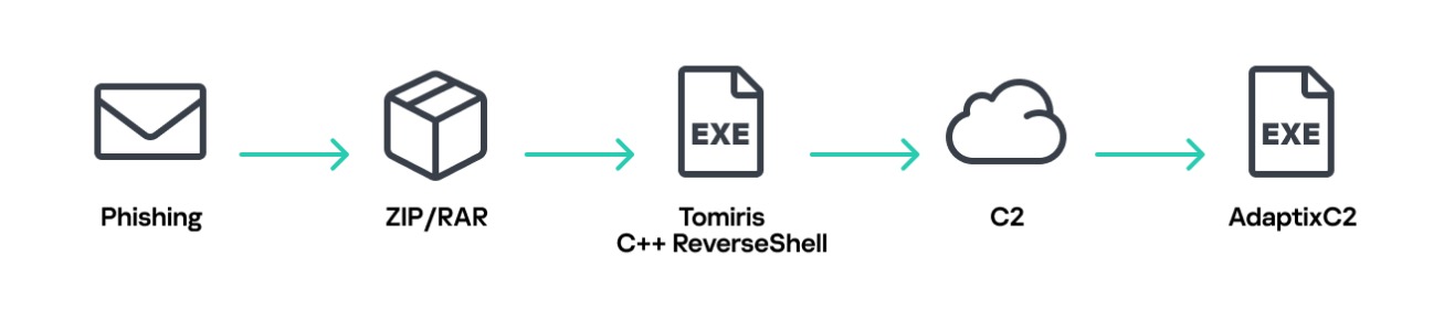 Схема заражения Tomiris C/C++ ReverseShellНа следующих этапах атаки малварь устанавливает дополнительные инструменты, включая фреймворки AdaptixC2 и Havoc, для дальнейшей эксплуатации и закрепления в системе. Для бокового перемещения по целевой сети обычно используются обратные SOCKS-прокси, основанные на публичных GitHub-проектах.