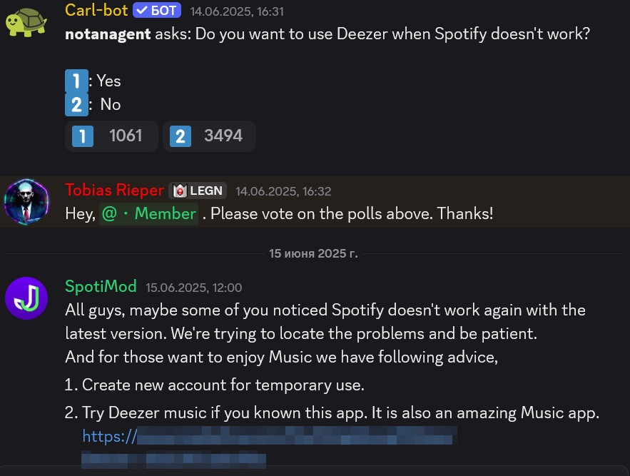 Еще один канал распространения малвари — серверы Discord. Самый крупный из них — Spotify X, насчитывает около 24 000 подписчиков. Администраторы серверов напрямую предлагают пользователям зараженные моды. Например, один из админов советовал скачать мод Deezer вместо Spotify, поскольку последний перестал работать.