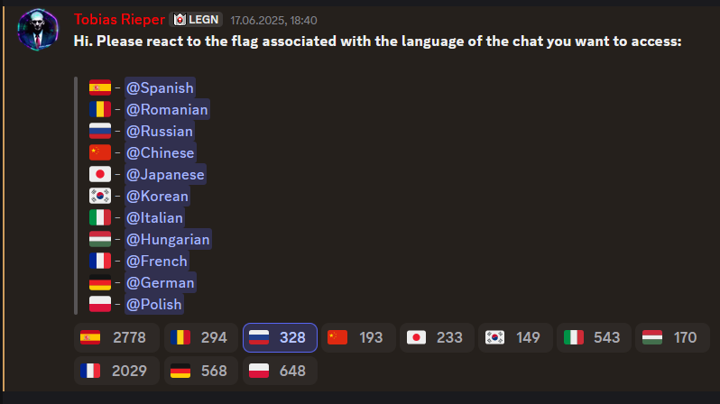 Статистика с одного из Discord-серверов показывает географию жертв, так как для доступа к чатам на разных языках необходимо поставить реакцию с соответствующим флагом. Судя по этим данным, больше всего пострадали пользователи, говорящие на испанском, французском, немецком, польском и итальянском языках (не считая английского, так как это основной язык сервера). Кроме того, администраторы сервера не предусмотрели отдельных чатов для многих стран Азии.
