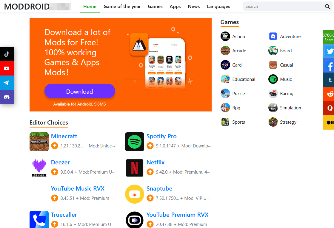 Загрузка на обоих сайтах осуществляется с одного CDN — hxxps[:]//cdn[.]topmongo[.]com. Кроме того, у этих сайтов есть свои Telegram-каналы: Moddroid.com (87 653 подписчика) и Apkmody Chat (6 297 подписчиков).