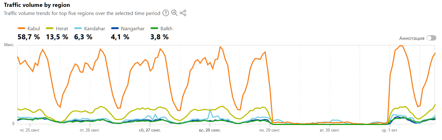 Напомним, что 29 сентября 2025 года в Афганистане была введена полная блокировка интернета. Специалисты NetBlocks и Cloudflare писали, что сетевые провайдеры в стране были отключены поэтапно, и телефонная связь также работает с перебоями.