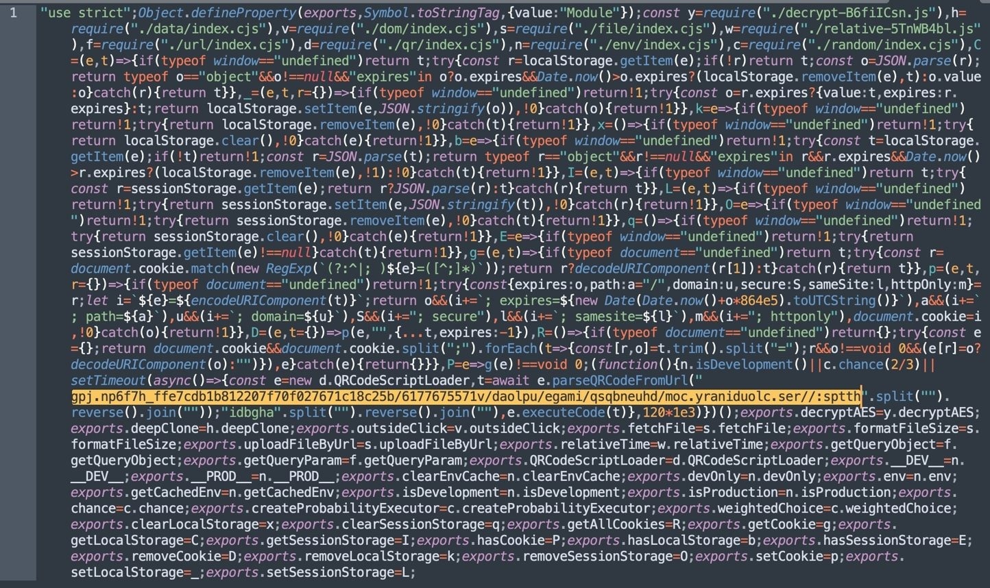 В итоге при обращении строки получается URL-адрес. По словам специалистов, хранение URL в обратном порядке — техника маскировки, которая используется для обхода инструментов статического анализа, ищущих в коде URL-адреса (начинающиеся с http(s)://).«Злоумышленники не хотят рисковать и быть пойманными в виртуальной или любой непроизводственной среде, поэтому добавляют ограничения на то, когда и как работает их эксплоит, — объясняют исследователи. — Если проблем не обнаружено, спустя 120 секунд, он парсит и выполняет код из QR-кода по адресу из обращенной строки».