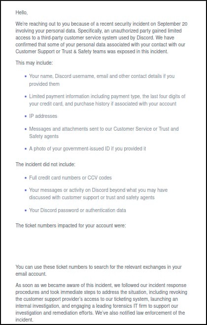 Среди скомпрометированных данных были:«Принятые меры включали отзыв доступа поставщика клиентской поддержки к нашей системе тикетов, запуск внутреннего расследования, привлечение ведущей компьютерно-криминалистической фирмы для поддержки наших усилий по расследованию и устранению последствий, а также обращение в правоохранительные органы», — сообщают представители Discord.